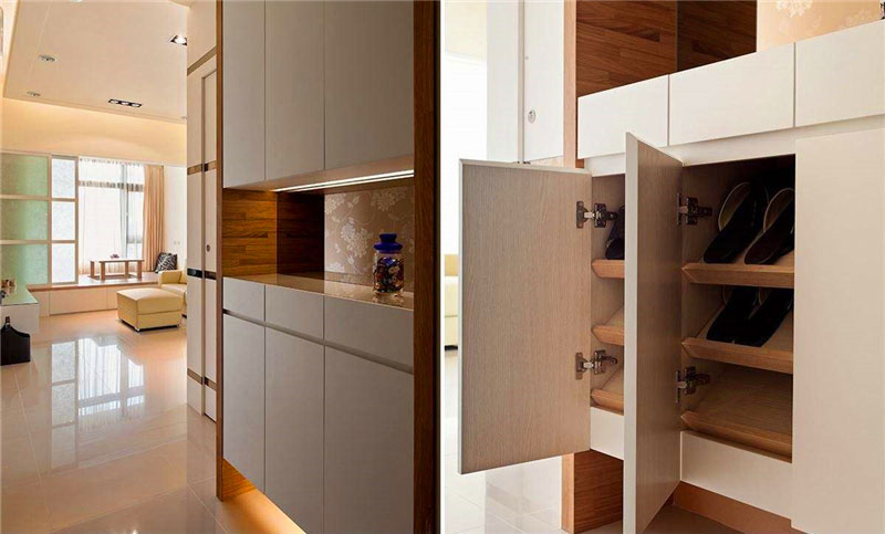 鞋柜安装在进门的位置,为了更加的美观,节省空间,那么内嵌式的鞋柜可以很好的实现这样的要求,入门处干净整洁。