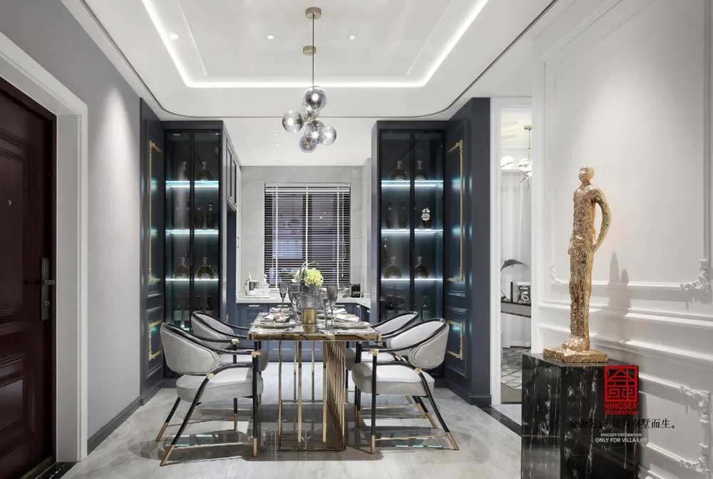 深蓝、古铜和灰色调勾勒出绅士的高雅格调和品味。从空间利用到配色处理,匠心独具,每一个空间都浓缩着设计师对新古典的独特理解。
