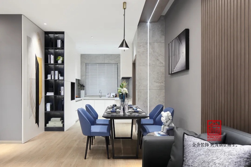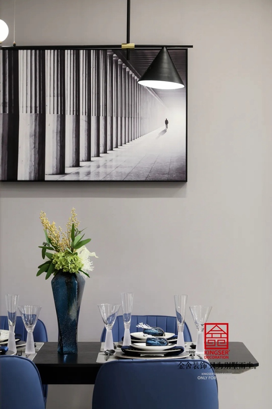 餐厅中运用灰蓝色色调,无需过多装饰,简约才是生活本味。整体的空间较小,能满足基本的功能。在方寸间也能表现出一种舒适的感觉。