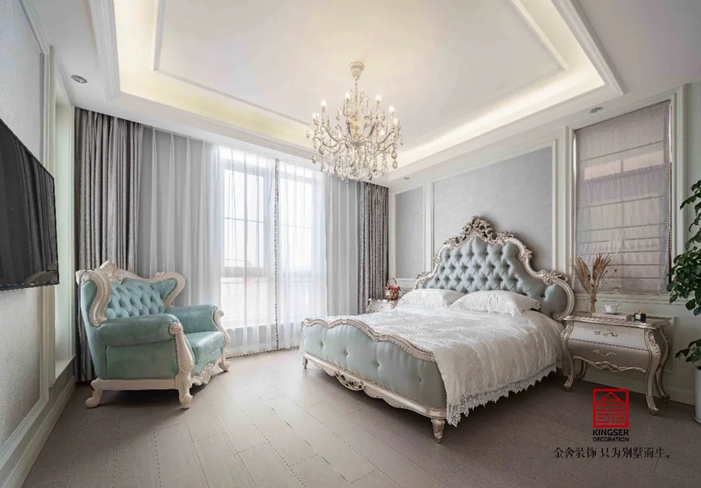 柔软的床包和床品赋予了空间丰富饱满的情感,经典的欧式装修风格表现奢美华贵的格调,而背景墙上的清淡壁布则为空间带了清幽的美感,增添清新之色。