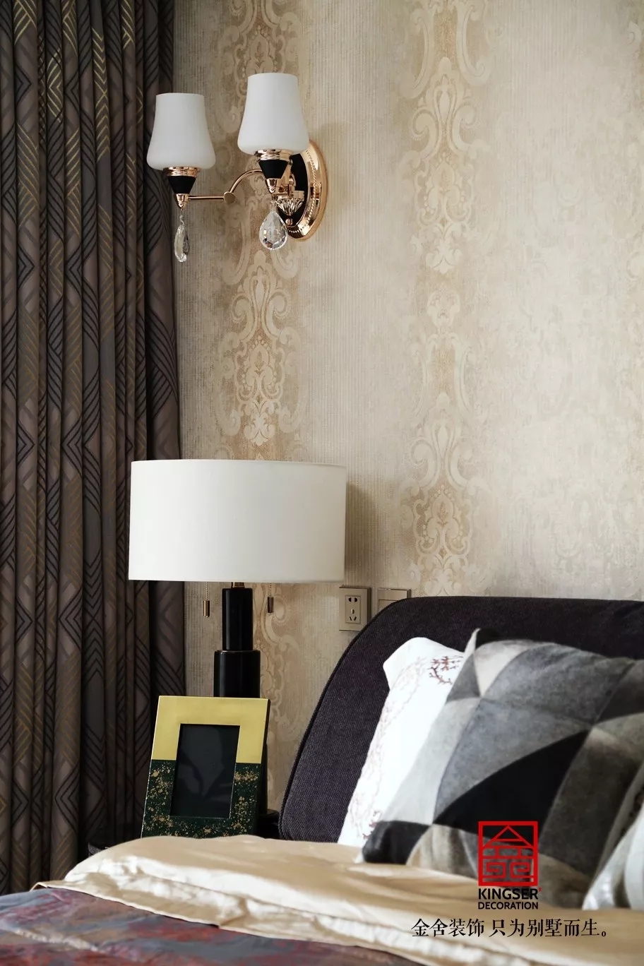 设计说明:此案例为石家庄taptapvip入口装饰-国富华庭180平米现代简约装修实景。黑白相配的吊灯,半亚光迷彩感十足的床品配合黑色时尚的软床呈现丰富的层次感,在阳光的映衬下呈现出一个充满温馨与质感的空间,床上的金色饰品将房子的格调瞬间提升了起来。