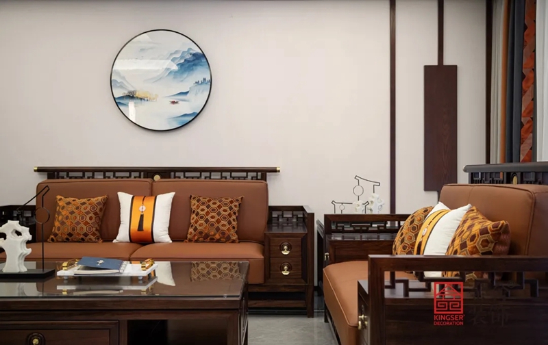 诗如明月,飞波扬彩;明月如诗,玉润冰清。客厅沙发背景墙的圆形装饰就如同一轮皎皎于天际的明月,晕染了整个空间,唯美之感顿生。电视墙对称的花格设计突出了传统中式的风范,古典精致的空间不失通透灵动的气质,山水感十足大理石与造型古朴的壁灯结合,稳重大气。色彩浓厚的软装配饰在这魅力的客厅里,随性地挥洒出沉稳的古朴之美。