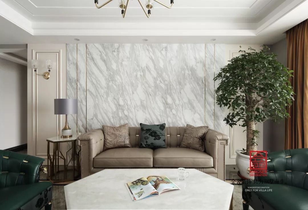 立于纷扰的世界,人们马不停蹄的寻找独属自我的生活方式,空间成为了投射自我的一面镜子。客厅中的事物就是一个个满足生活需要的元素,因为有他们存在我们才有现在的生活,一深一浅一素一浓的沙发在阳光下奕然生辉,融合多色调的绿色夹杂着自然纹路大理石,为整个空间创造出一种自然风十足的环境。