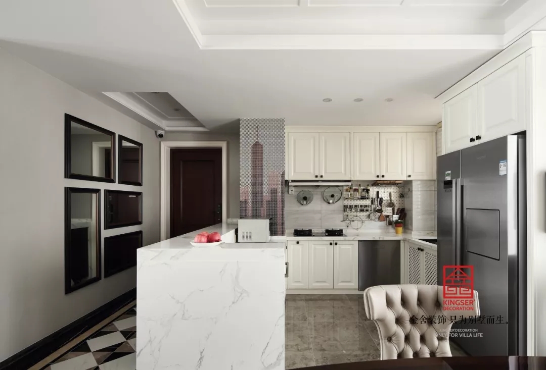 厨房采用的是开放的西厨式设计,不算很大的空间内将所有的电器及其他厨房设施都安排得井井有条,剪影一般的画作让这个空间多出一份梦幻的色彩。