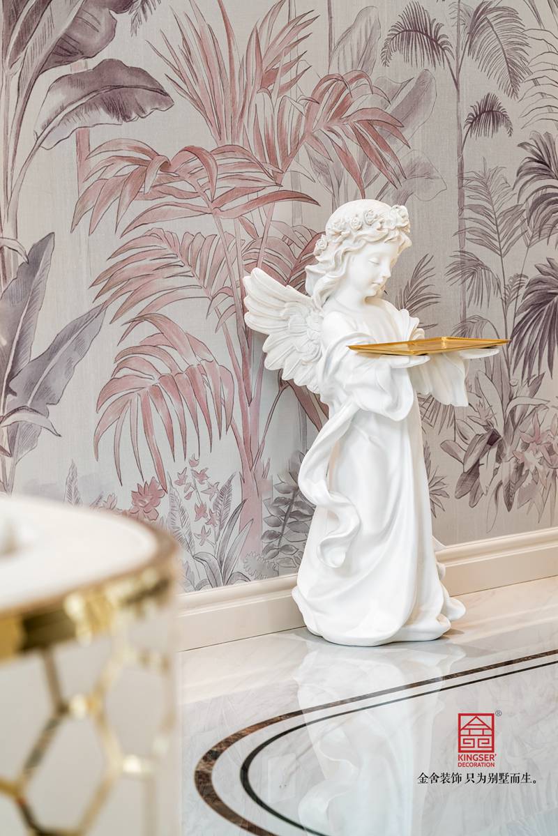 别墅装修实景,灰白色的空间中,任何颜色的出现都会晕染出一分纯洁中的靓丽,浪漫主义的风格让整个空间即素雅又灵动。茶几以及布艺的沙发搭配,提升了整个空间的质感与设计美感。
