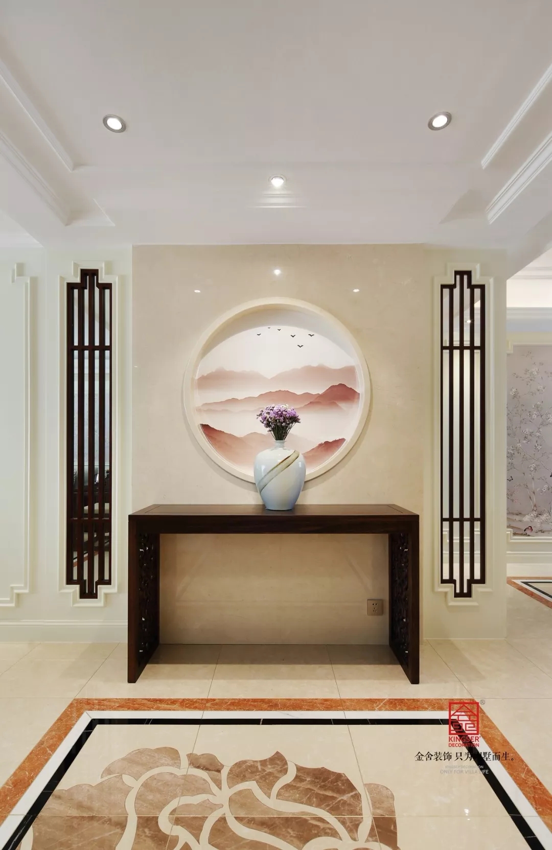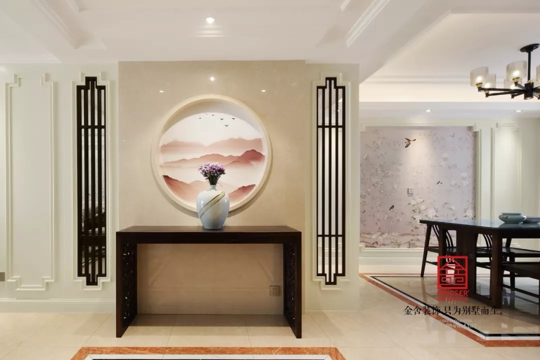 玄关走廊淡素色墙面,质感简单又沉稳、原始又兼具现代感,圆形的窗棱感觉与水墨风的壁布融为一体,即凸显出中式风的特色,又形成色调上浓淡界限,增加空间层次。两边的木质窗棱简洁朴质,顶面的射灯映背景墙,为朴厚空间注入柔美与雅韵。