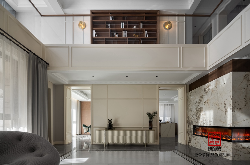 别墅的客厅,无疑是整栋建筑中的璀璨明珠。在挑高六米的宏伟空间中,我们巧妙地布置了一个简约风格的转角壁炉区,与素色沙发相映成趣,营造出一种既现代又舒适的氛围。