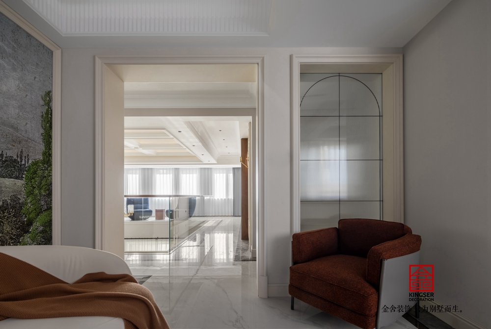 二层空间进行了很大范围的改动,在二楼专门搭出了一个休闲观景区,保证空间的完美利用的同时,又给人一处放松的空间。同时将一个卧室改成了书房,透明隔墙的处理,增加空间采光,也是为了孩子们有一个很好的阅读上网的空间。