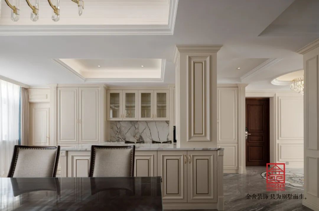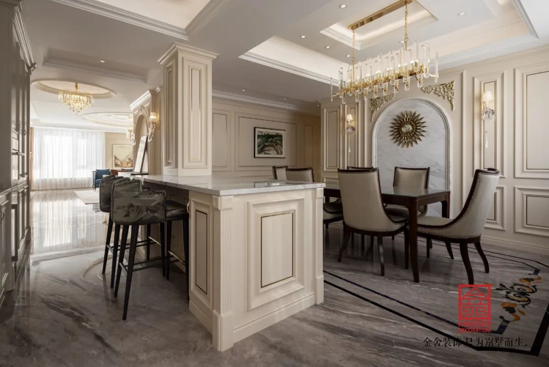 开敞式西餐厅,无时无刻不在提醒着要打破人与人的隔阂,繁琐而奢华的墙宛如电影质感般的栖居,浪漫、高级又不乏时尚感。