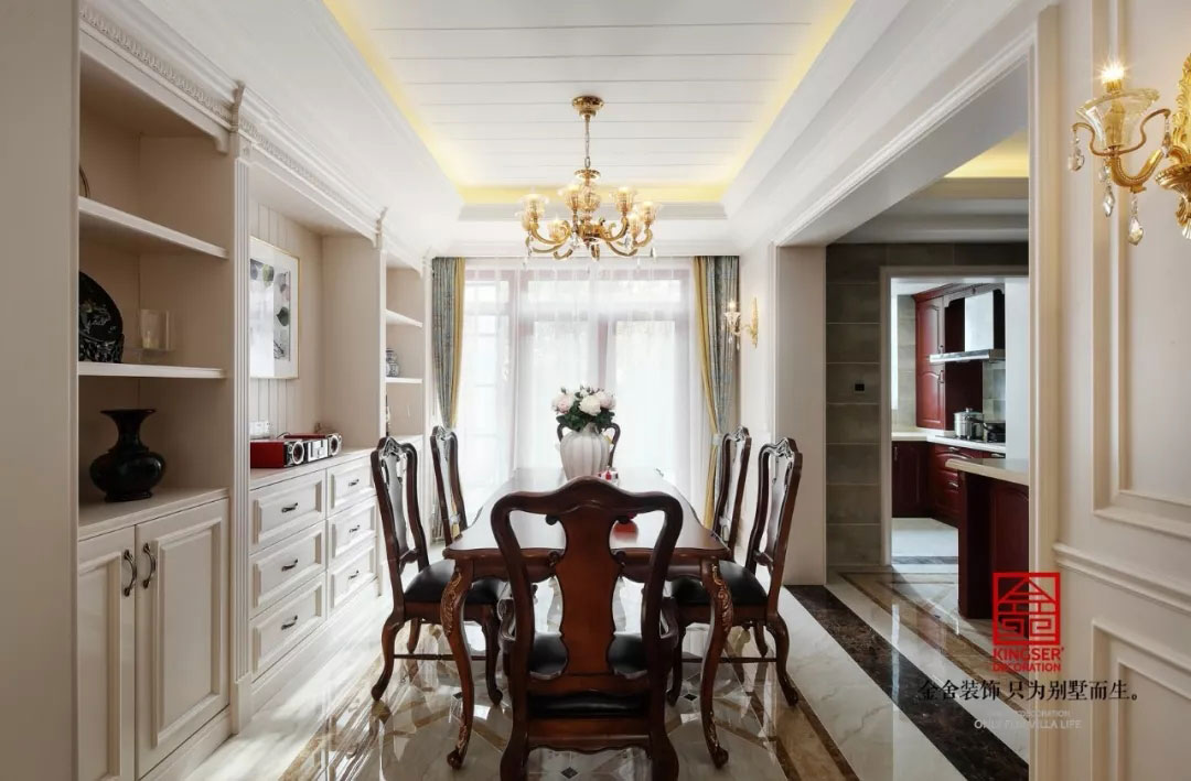 不再拘泥于平面,而是用高低差来做出空间的变化,使空间出现错落感。餐厅半开敞的设计很有西式厨房的风格,餐厅金色的欧式吊灯融入复古元素,镌刻着奢华与精美。