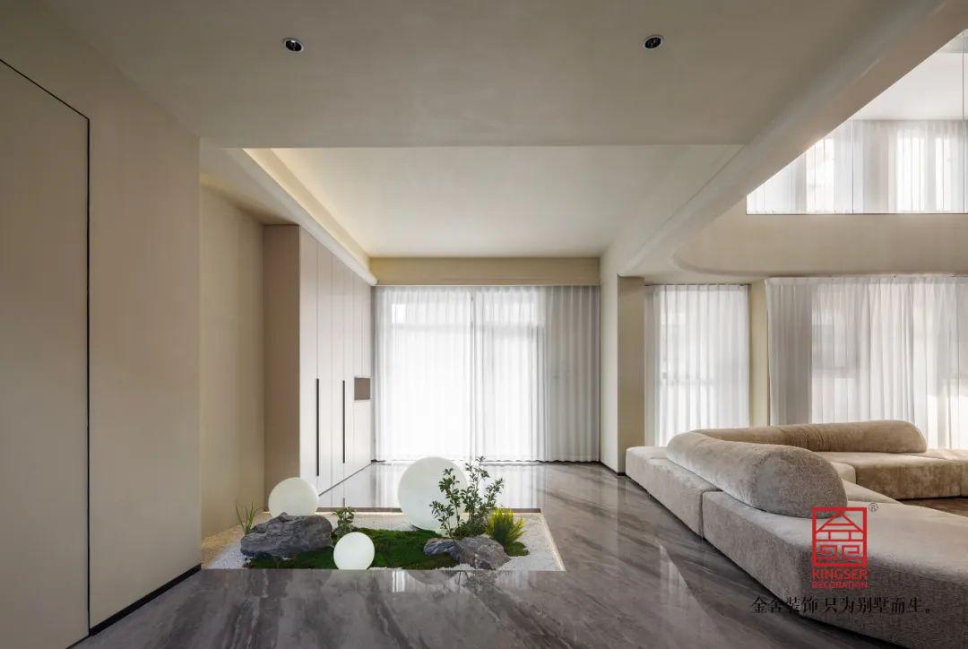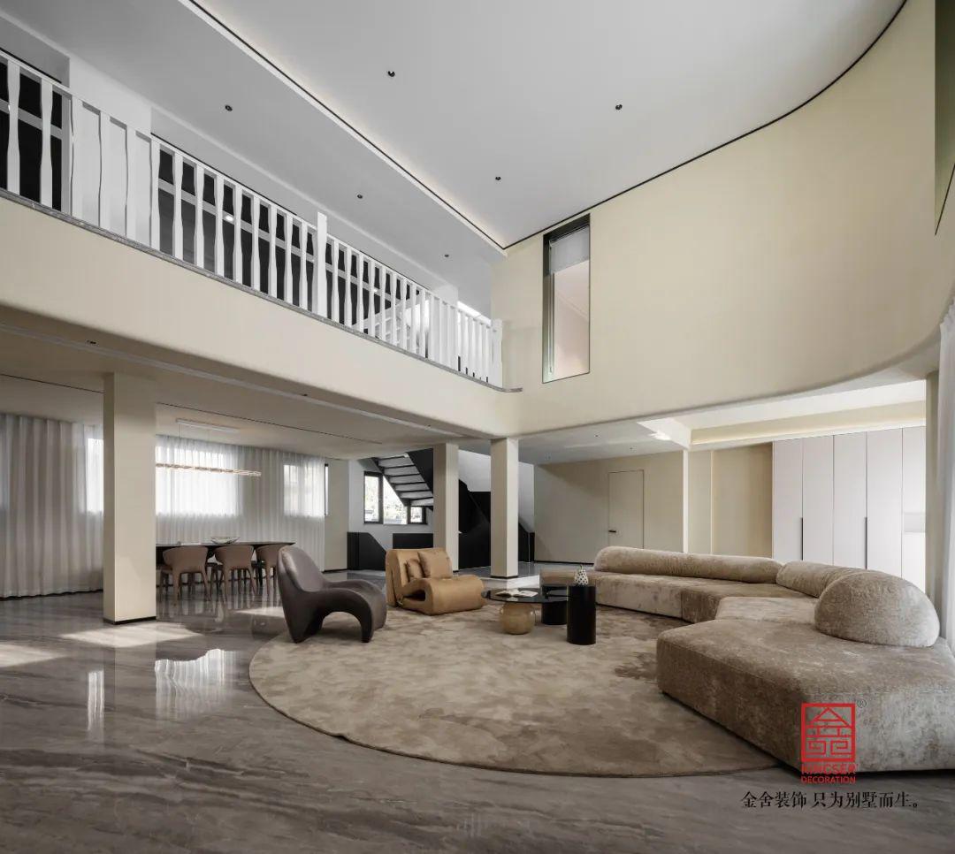 巨大的挑空空间之下,是设计师对于设计的把控,首层6米挑空客厅以钢化玻璃幕墙打造通透感,双层中空玻璃引入充沛自然光,半开放的厨房、岛台吧台与落地窗景融为一体。全屋采用暖白、卡其、米咖等低饱和色调,墙面哑光质感涂料与浅咖沙发碰撞,塑造出极具质感的空间。