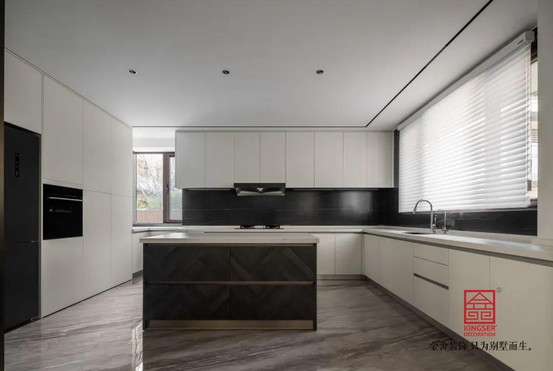 黑白配色的半开敞式厨房,中导台也置入其中,经典的配色随时都不会让人感觉到厌烦,巡回式动线合理且流畅。