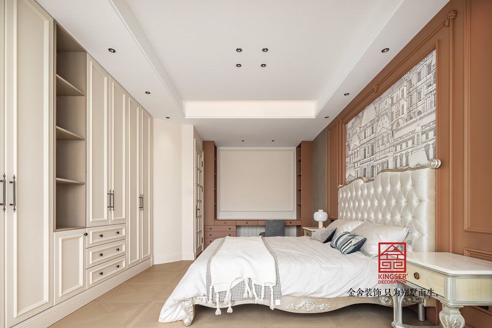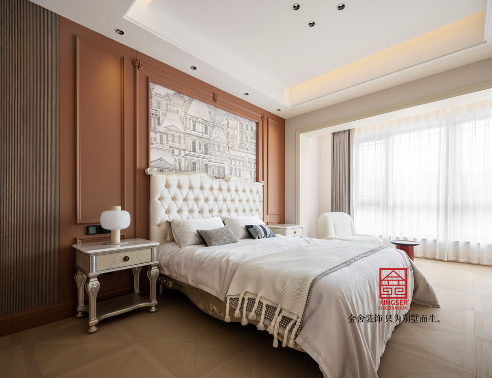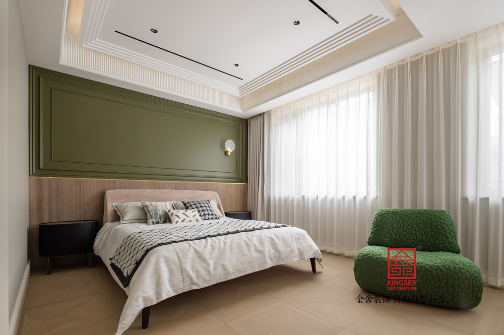 三楼主卧空间纳入窗外四季风光意境,简洁、舒适、宁静,在这个卧室体现得淋漓尽致,设计就该更于回归生活,并非不食烟火,而是剔除了方方面面的冗杂,以更鲜明更清晰的方式去表达出眼下的状态。