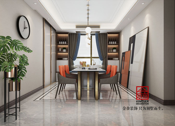 客厅造型别致的几何茶几组合与暖橙色单人沙发的搭配,让空间在低调的氛围中滋生少许精致的美感。餐厅是客厅美感的延续,岛台与餐桌的结合让空间更饱满,功能性也进一步提升。黑白对比分明的色调,凸显高级质感。极简的吊灯带来的不仅是明亮的光线,更是生活中不可缺失的小情调。