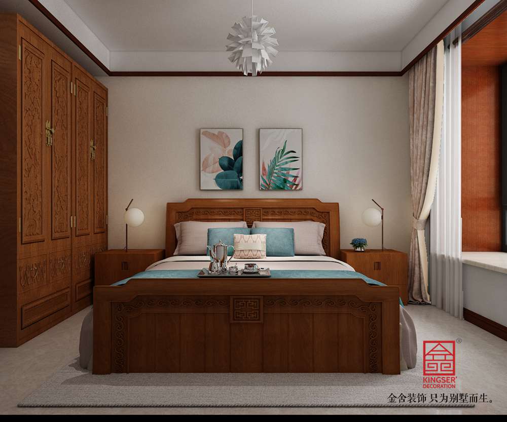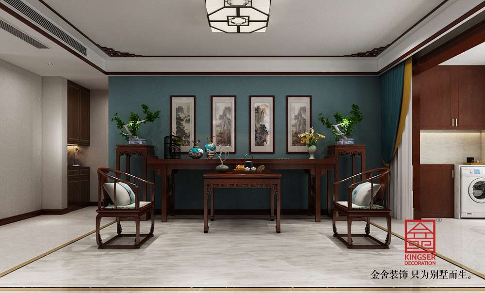 -融创中心217平米中式风格装修效果图。以深色为主,有深厚沉稳的底蕴。装饰造型主要采用硬朗简洁的直线条,空间具有层次感。既使得中式家具古典、质朴的内涵显现,又符合现代人追求的时尚感、实用性。