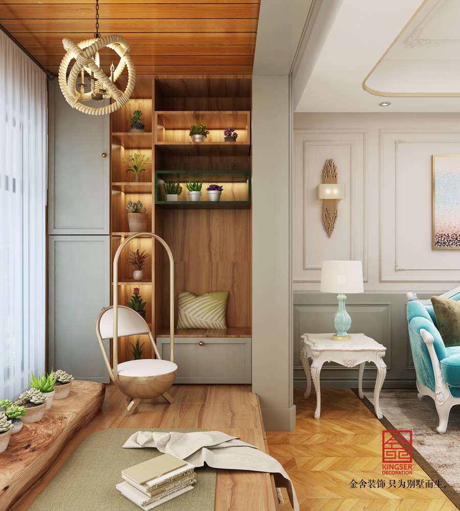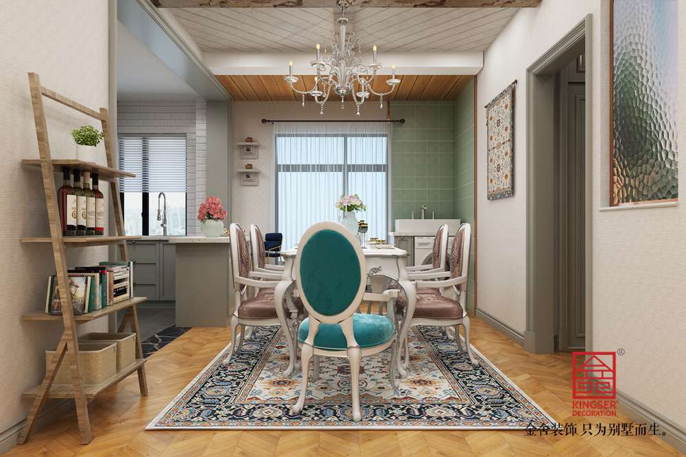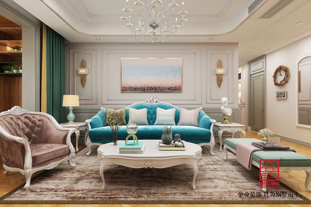 设计说明:此案例为石家庄taptapvip入口装饰-东南智汇城126平米法式轻奢风格装修效果图。蓝色系具有立体感的沙发颜色,使墙面很显层次感;多彩的地毯、灵动设计的台灯、不拘一格的挂画,营造出一幅自由、温馨、浪漫的氛围;而客厅旁的落地窗给足了这间空间明亮的自然采光,用餐区域餐桌上方的水晶吊灯与客厅中的精致吊灯遥相呼应,让整个空间之中都映射出一种浪漫氛围,法式风格如同法国这个国家一样,浪漫迷人,仿佛普罗旺斯的阳光,洒满你的家。蓝色调营造浪漫时尚法式风情,寻求心灵的自然回归感;将法式传统的三颜色与当季流行色融合,不失法式的贵气和浪漫