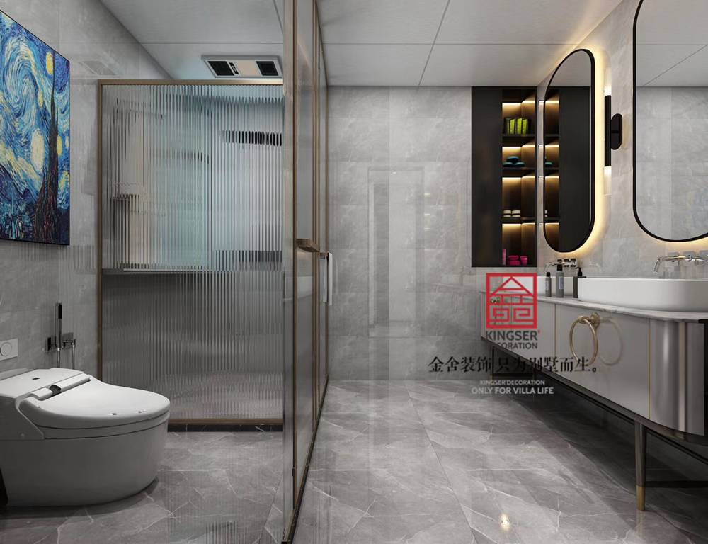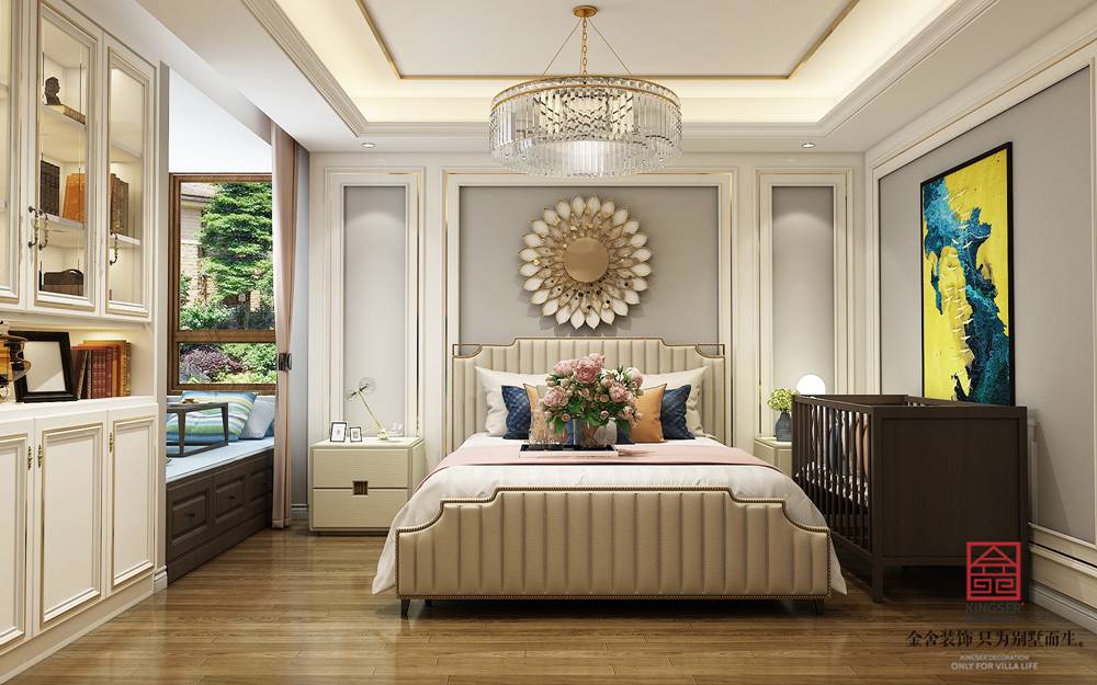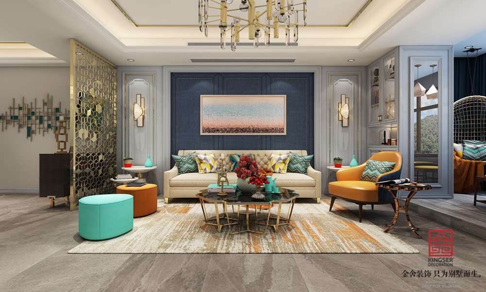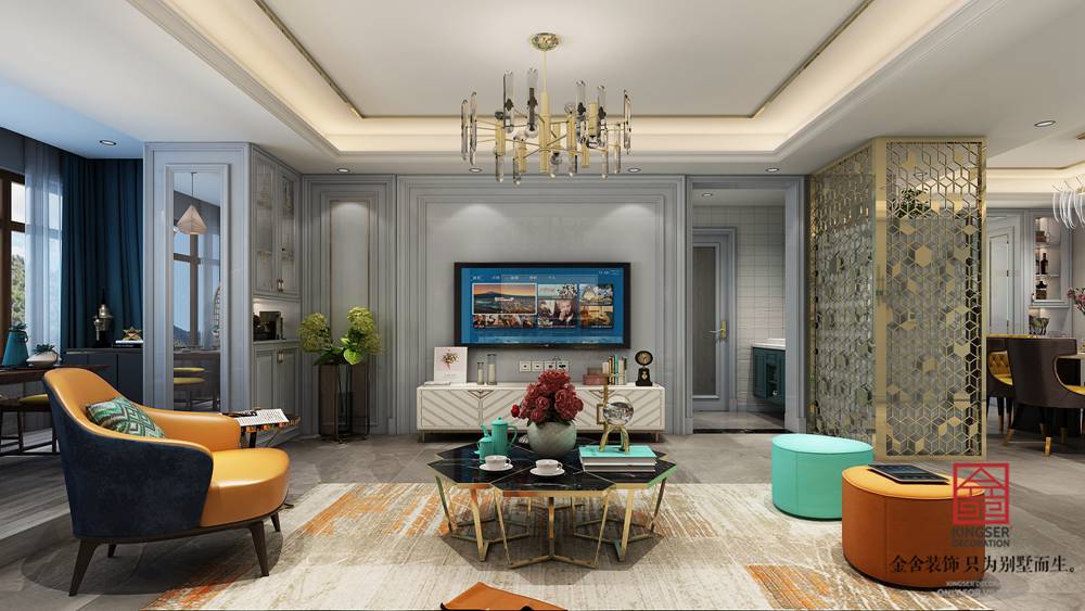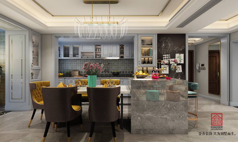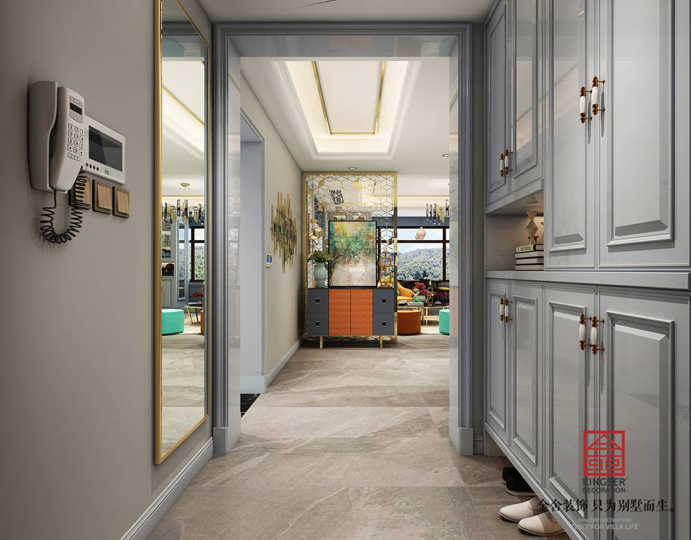 此方案是石家庄装修公司-健康城160平米美式风格装修效果图。以美式轻奢定义的一种风格,美式轻奢在生活方式上延续了美式风格的轻松自由,又添加了一些当代元素。本案在装饰手法上巧妙的运用了哑光的复古砖,隔断玫瑰金不锈钢,简单的美式线条等来提升质感。以蓝灰色为主调,超脱凡俗的蓝灰调,将小资情调流露,彰显轻奢大气。入户玄关开阔明亮,以灰蓝色搭配着深色瓷砖做对比和呼应,简洁的铺贴与屋内美式轻奢氛围呼应本案例,在看似漫不经心却故意营造着一种十分温和的轻奢表达。