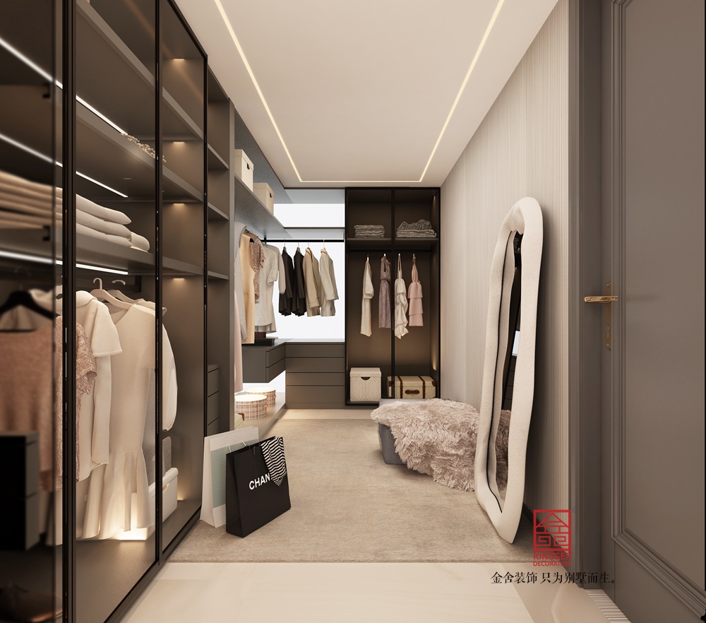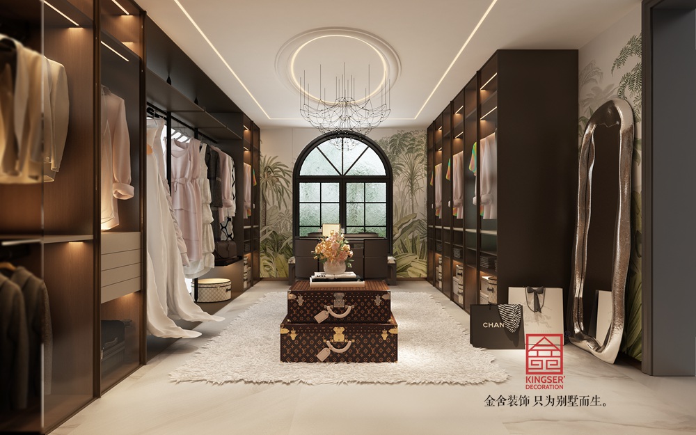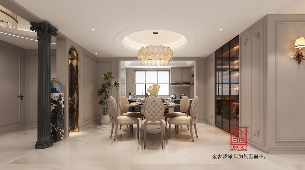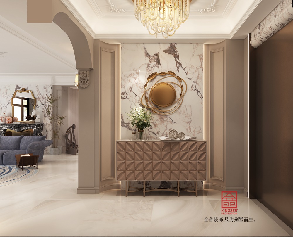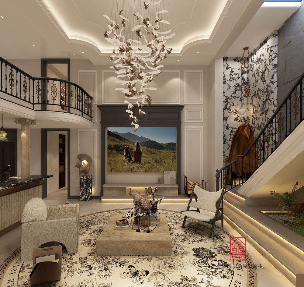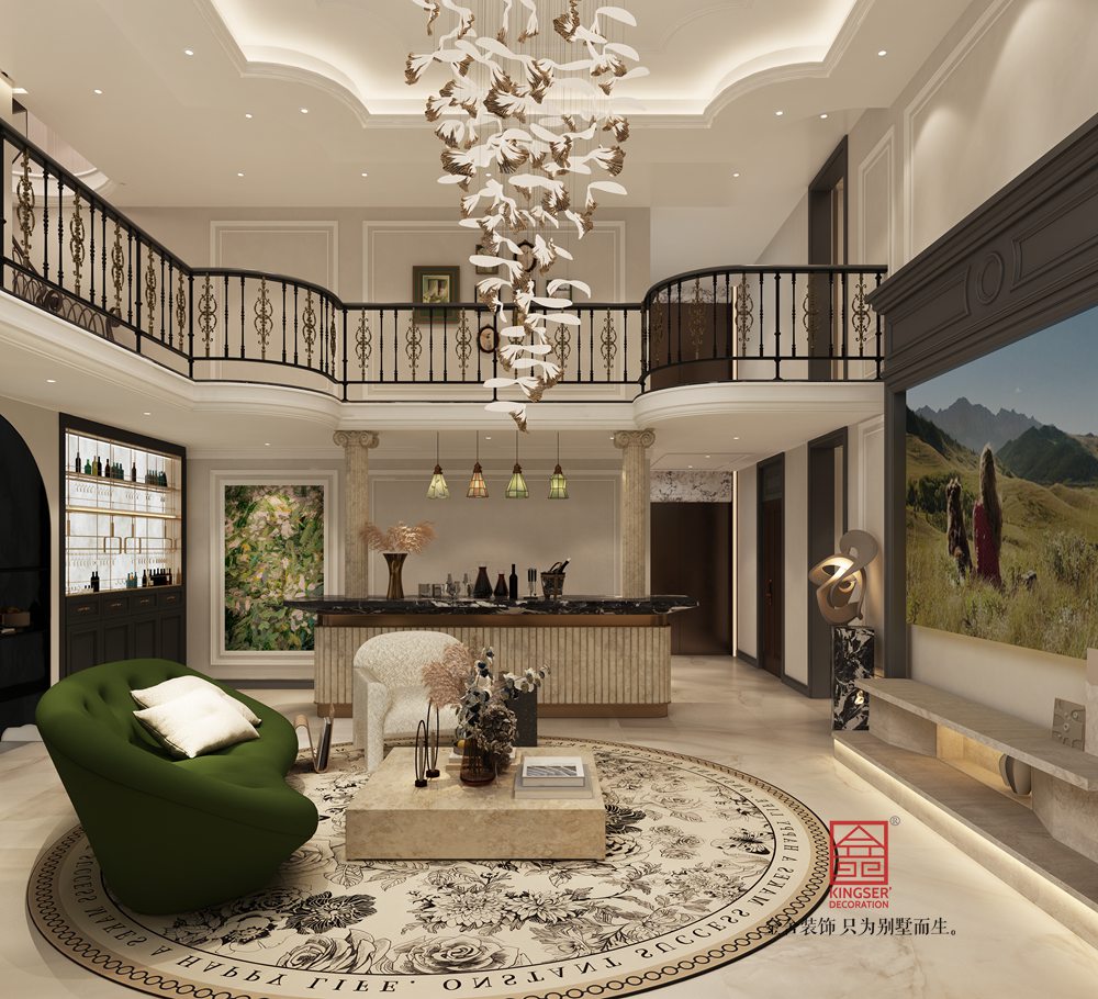 本案挑空客厅以新古典风格为基底,融合现代设计语言。运用经典的石膏线、护墙板勾勒空间秩序,搭配简约造型的家具与艺术吊灯,既保留古典的优雅韵味,又注入当代的时尚与灵动,实现传统与现代的对话。