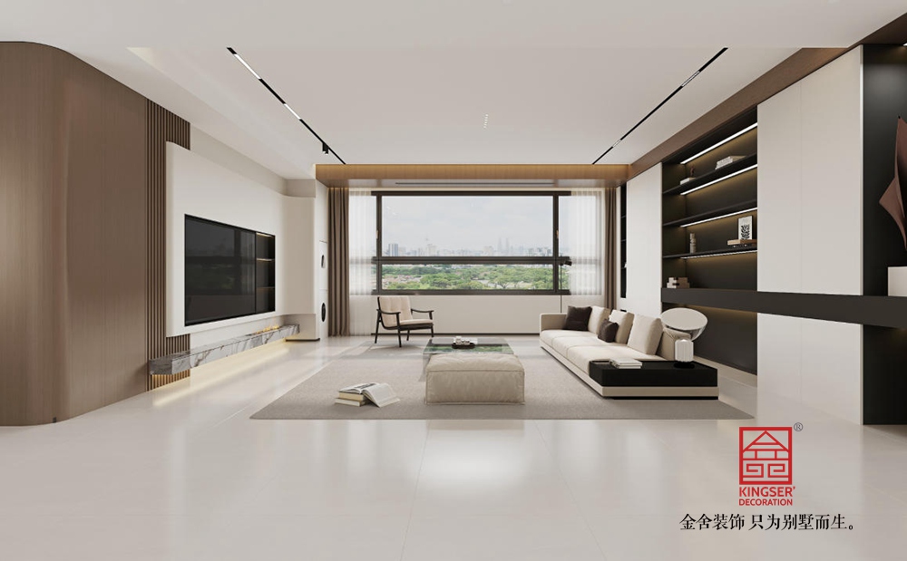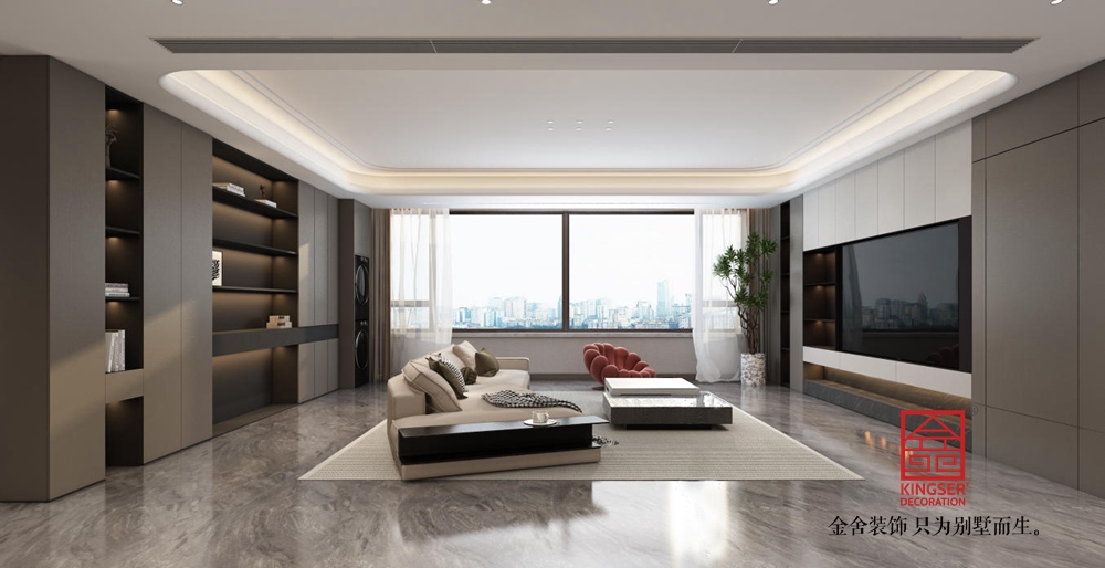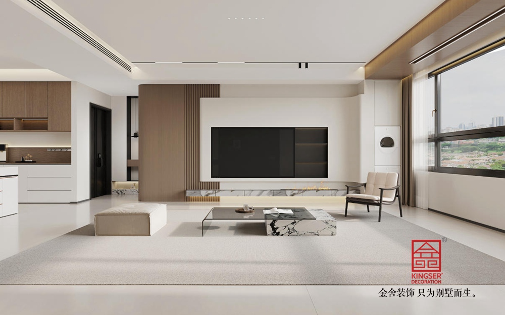 空间布局上,采用开放式设计,让客厅与周边区域自然衔接,增强了空间的通透感与互动性。大面积的落地窗是设计亮点,引入充足自然光线,同时将城市景观纳入室内,使空间与外界环境有机融合。