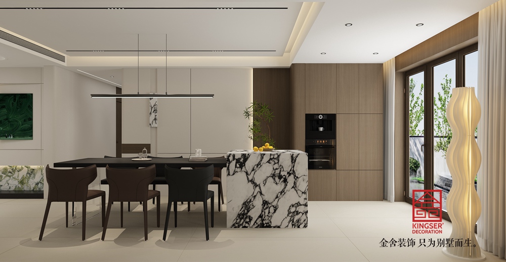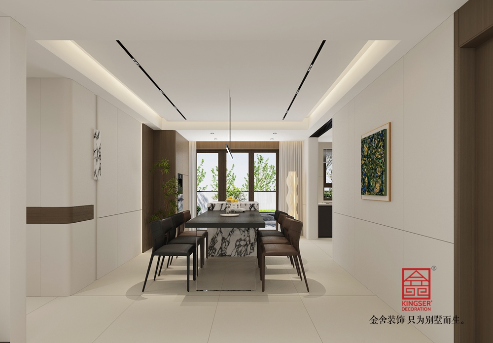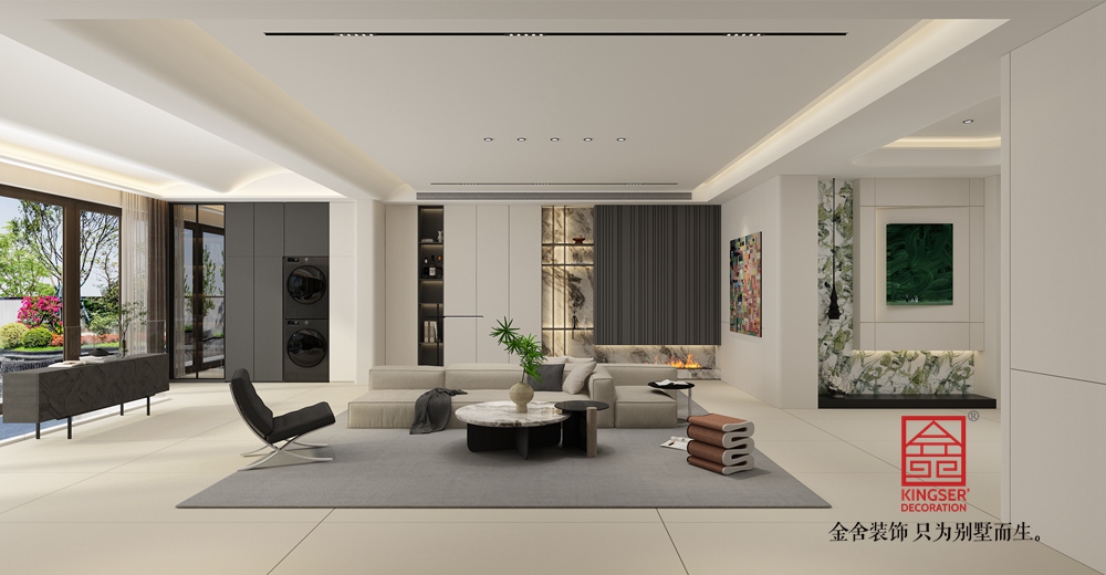 装饰上,左侧色彩绚丽的艺术画作,为空间注入艺术活力;绿植与特色摆件的点缀,让空间更显生机与个性。充足的自然采光透过大窗涌入,结合精心设计的室内照明,使空间明亮通透。整体设计简约却不失格调,每一处细节都彰显出对高品质别墅生活的用心营造。