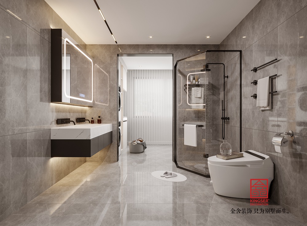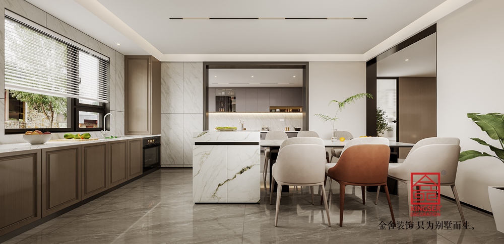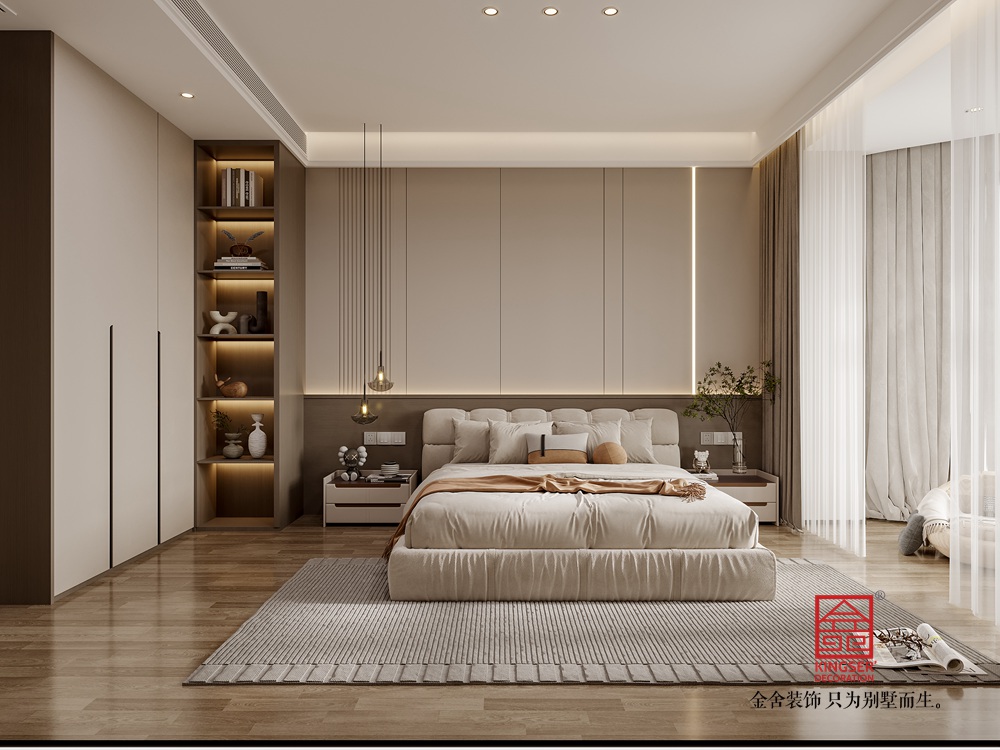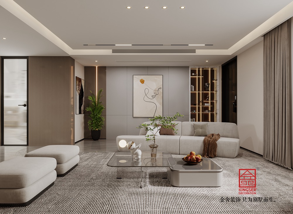 该别墅客厅设计遵循现代轻奢与极简融合的思路。整体色调选取低饱和度的暖棕、米白等,构建出雅致柔和的基底。大面积的墙面采用简洁的板材设计,干净利落,与嵌入其中的电视及两侧带有灯光点缀的收纳格相配合,既满足实用需求,又通过光影变化营造出轻奢氛围。
