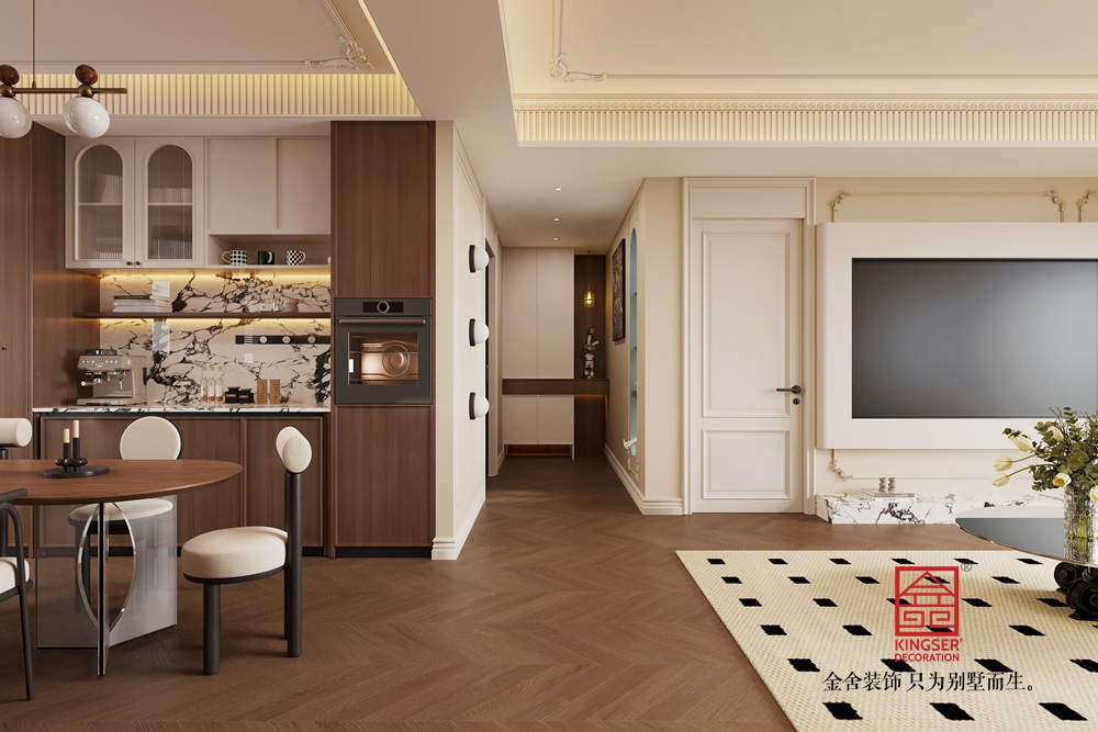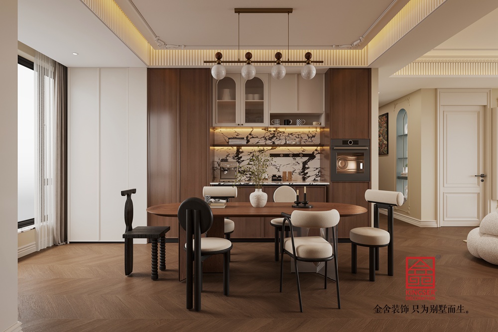 顶部独特的串珠吊灯,造型别致,灯光透过珠串散发柔和光晕,为空间蒙上一层复古浪漫的滤镜。背景墙的柜体设计,兼具收纳与展示功能,陈列的物品为空间增添了故事感与文化底蕴,整体打造出一个复古雅致且舒适宜人的中古风客厅空间。