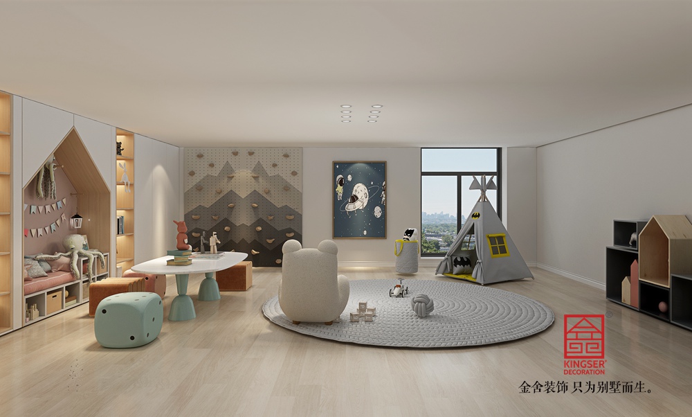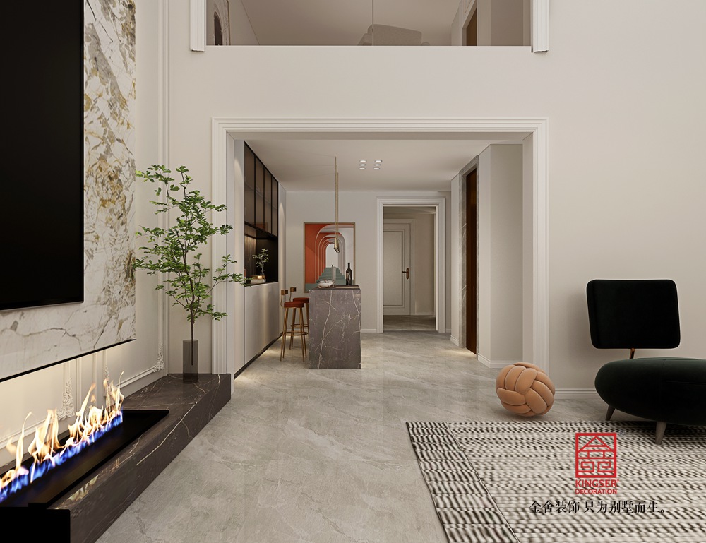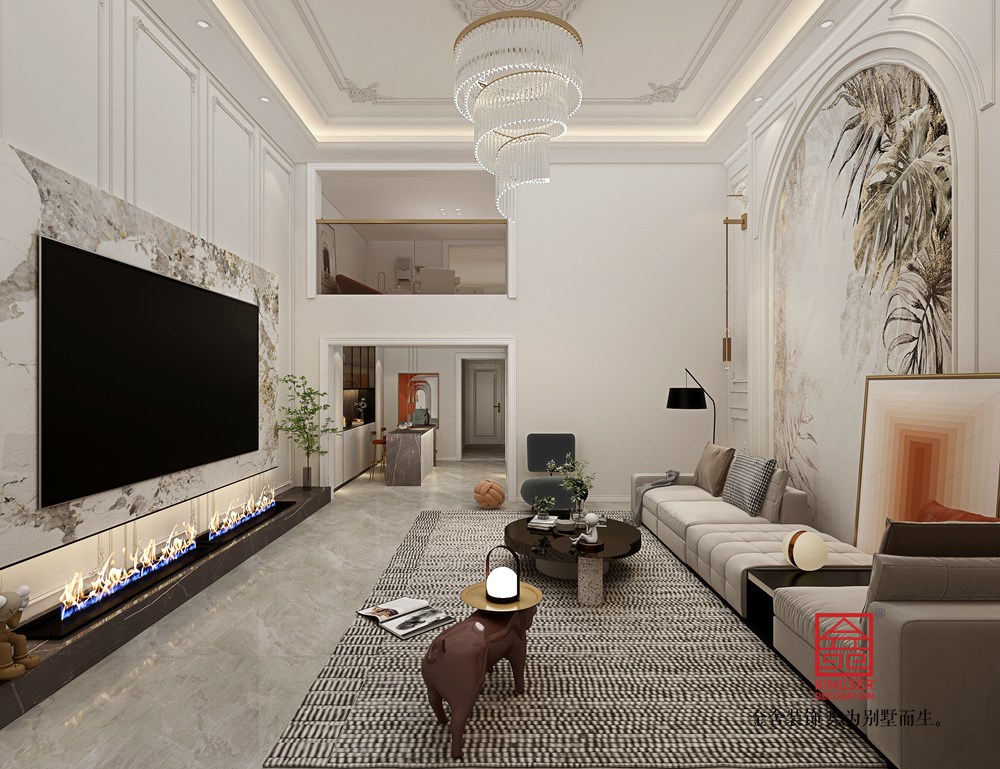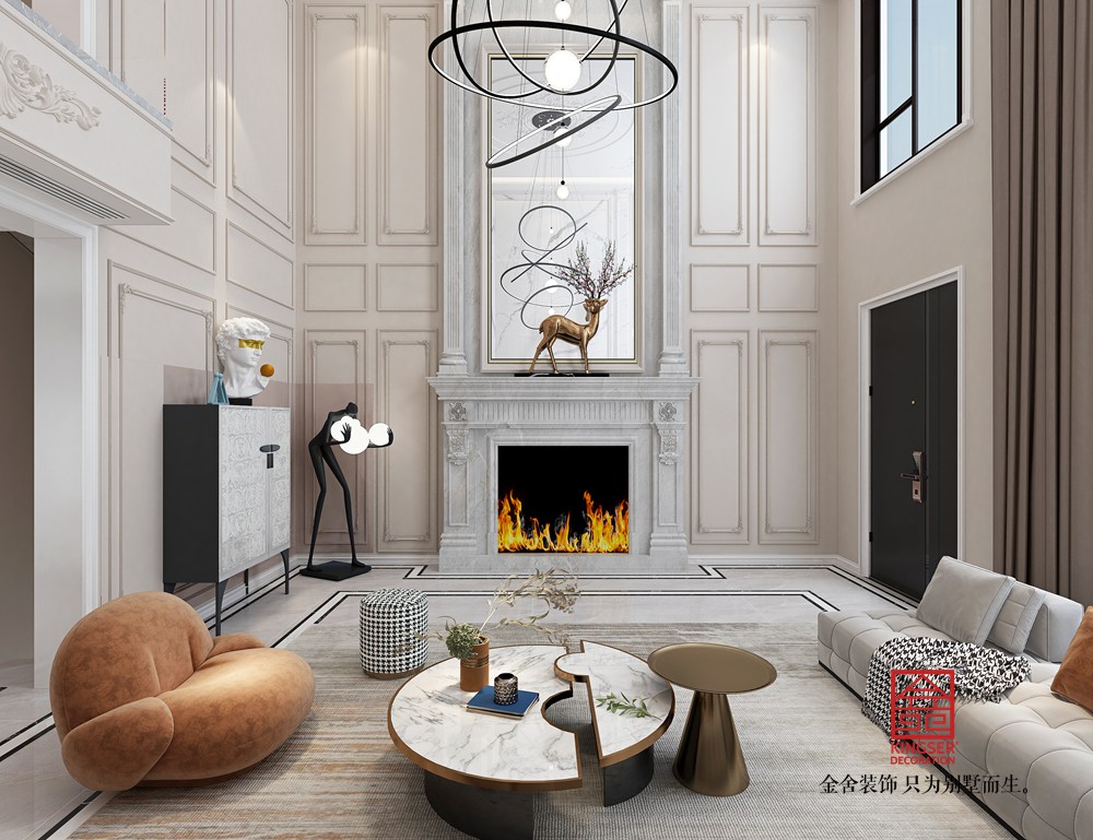 壁炉作为视觉中心,大理石材质的精致雕琢,结合上方艺术挂画与金色鹿形摆件,增添了艺术气息与奢华感。家具选择上,弧形的棕色单人沙发,以柔和的线条与温暖的色调,为空间注入舒适与活力;浅灰色多人沙发,搭配黑白花纹毯,平衡了色彩并提升了格调。
