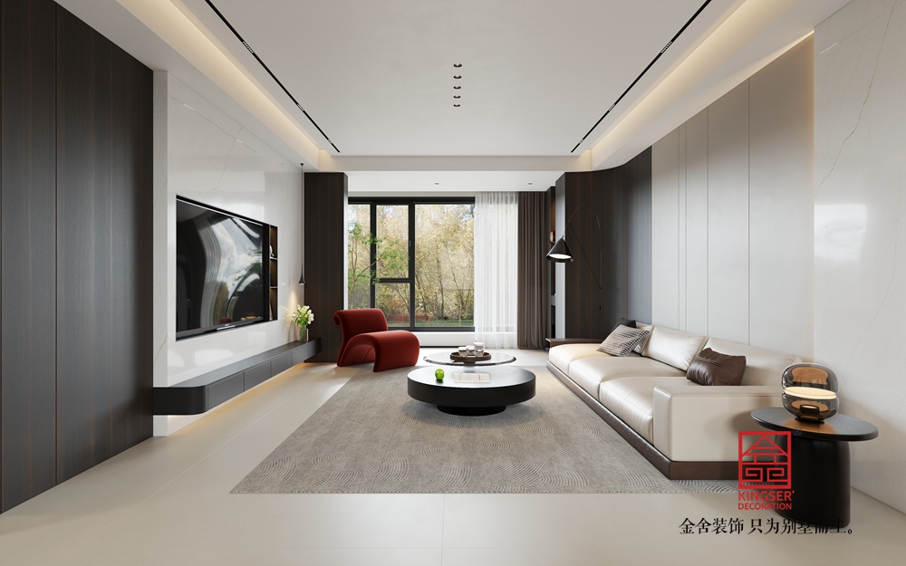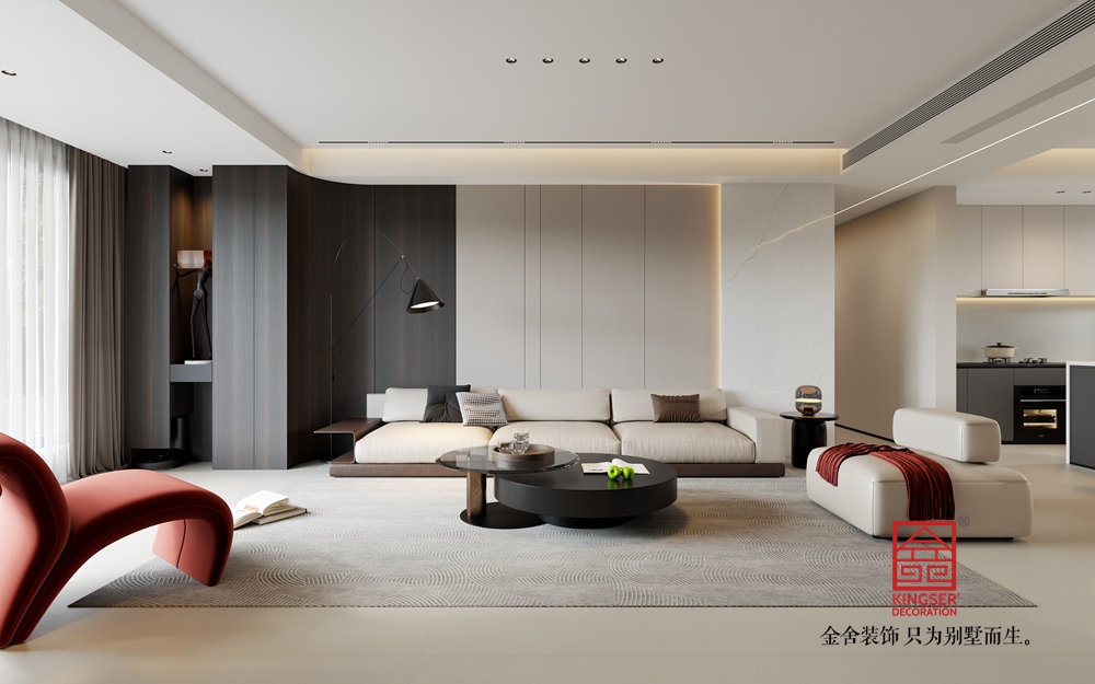 浅米色的大沙发,搭配色彩层次丰富的抱枕,为休憩提供舒适且具美感的载体。黑色圆形组合茶几,造型简约又不失设计感,与整体空间的利落线条相呼应。一旁的白色单人沙发,搭着红色织物,既丰富了色彩层次,又增添了温馨感,红色异形休闲椅更是以亮眼色彩和独特造型,成为空间的点睛之笔,注入艺术活力。